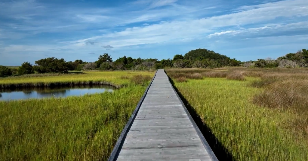 Enjoy six miles of protected shoreline spanning the Ocean to the River with over 288 acres that feature seashore as well as primitive trails meandering through the marsh past an actual WWII Bunker,once home of the fabled Ft. Fisher Hermit, ending in an observation deck. Loggerhead sea turtles, piping plovers and other rare and protected species nest along the sandy shore. Popular for surf fishing, four-wheel-drive vehicles are allowed seasonally with required permits. The parking area is near the Park Office and Exhibit Hall, changing area and foot rinses, and shaded picnic area with grills. Dogs on leashes are allowed on the beach year round. There is a boating ramp and paddling launch nearby. Please verify conditions prior to travel.